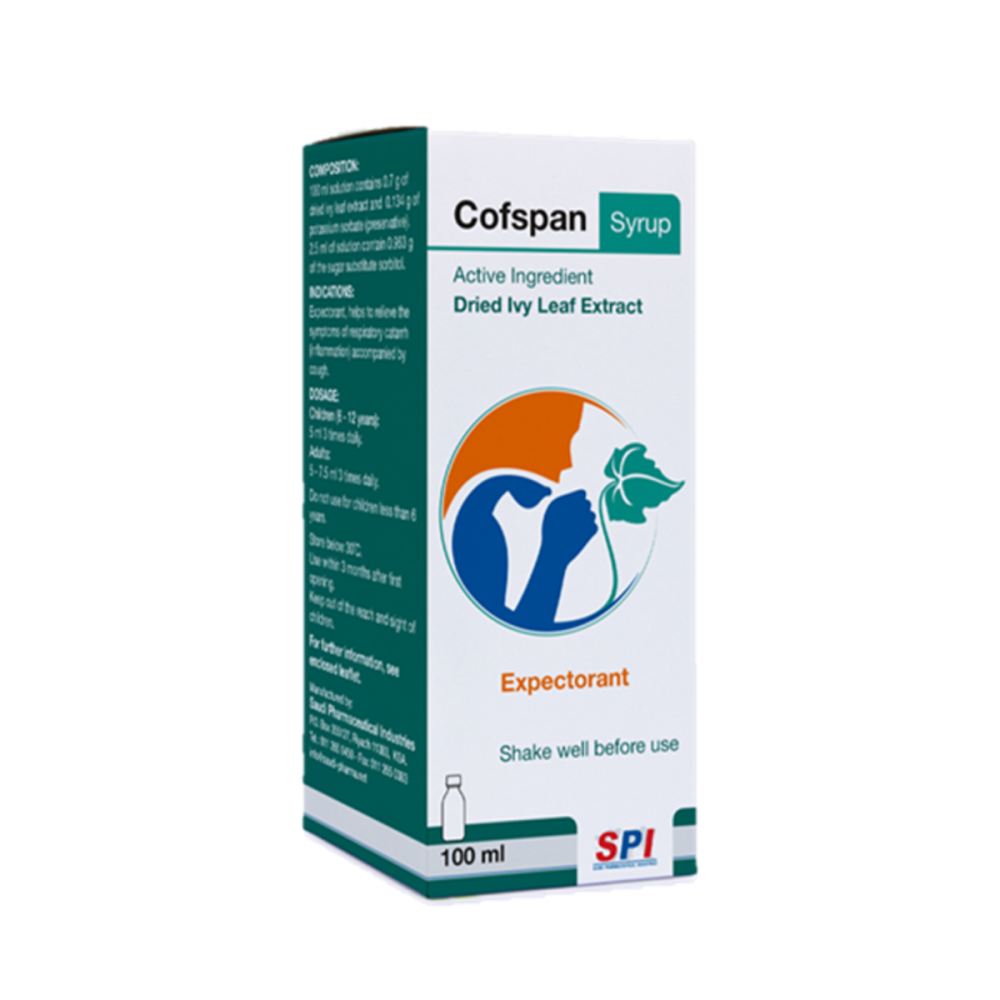 Read Moreكوفسبان شراب (Cofspan Syrup) هو مستحضر عشبي يُستخدم لتخفيف السعال المصحوب بالبلغم والتهابات الجهاز التنفسي. يحتوي على مستخلص أوراق اللبلاب المعروف بخصائصه الطاردة للبلغم والمهدئة للسعال.